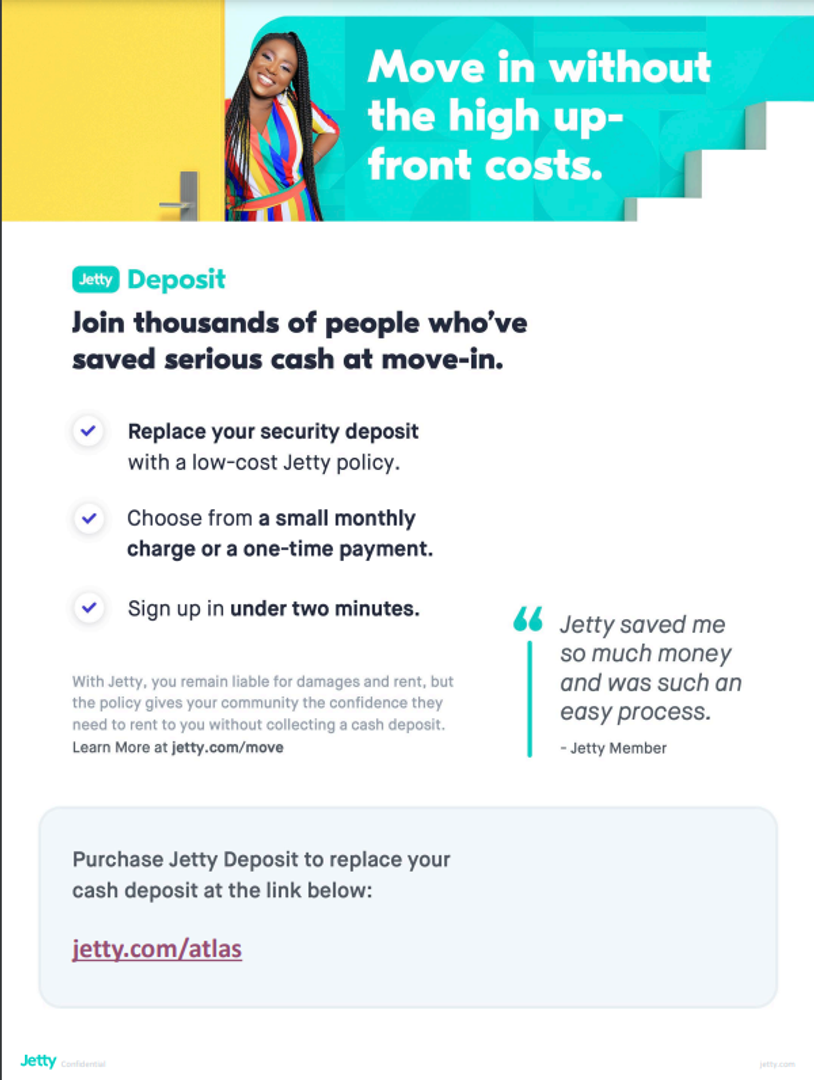 Deposit: Atlas Real Estate has partnered with Jetty to offer an affordable alternative to upfront cash security deposits. Residents approved through Jetty can choose between purchasing a deposit replacement policy with Jetty at a fraction of the upfront cost OR pay a security deposit as low as 1 month’s rent, for well qualified applicants.