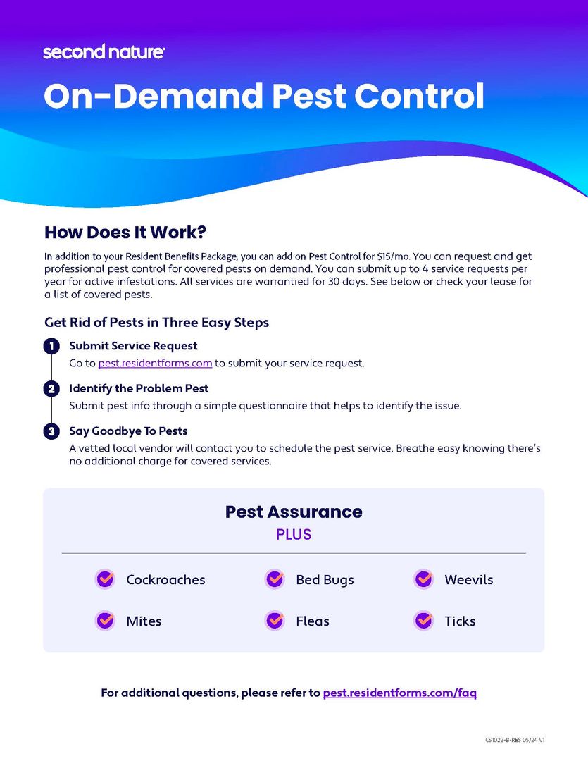* Optional pest control for $15/month (up to 4 service requests per year, 30-day warranty; must be selected at move-in)