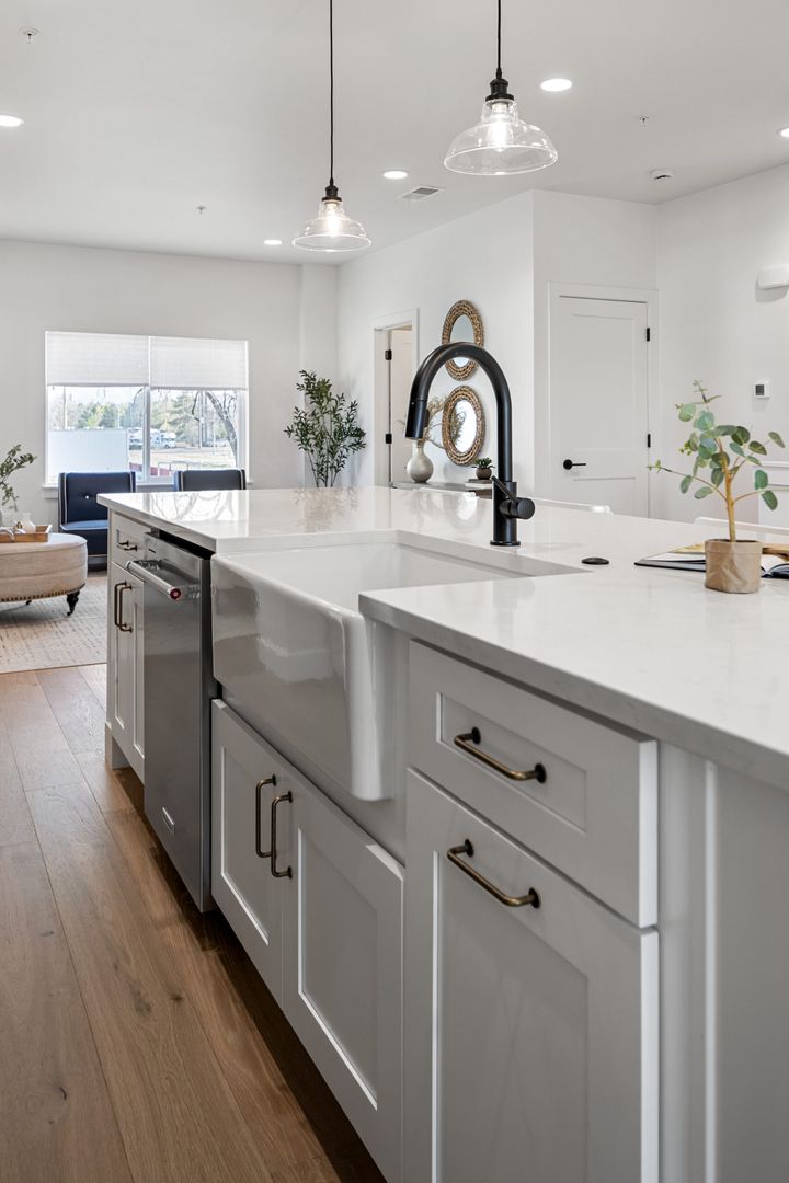 • KitchenAid appliances, quartz countertops, and farmhouse sink