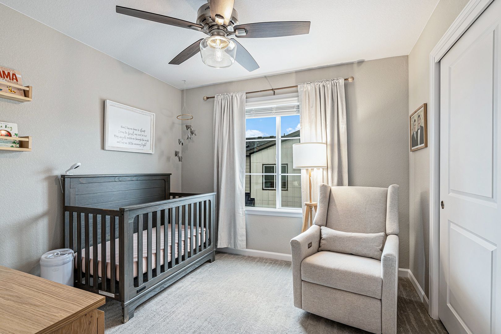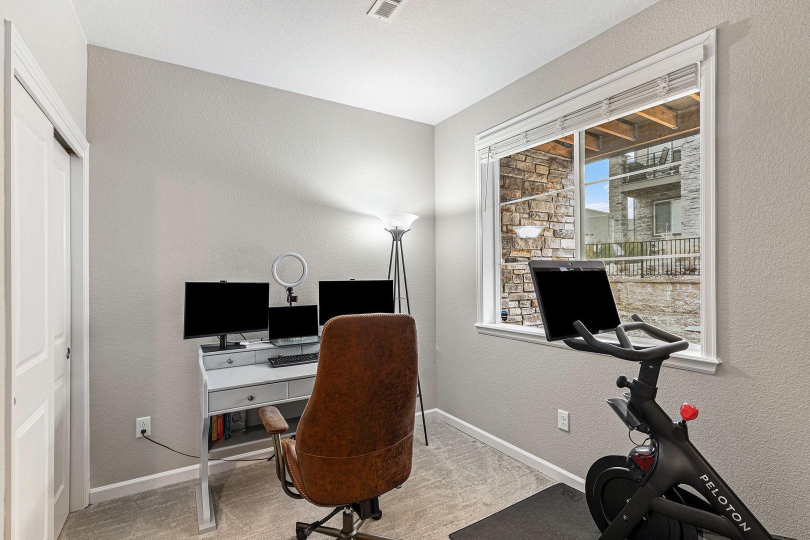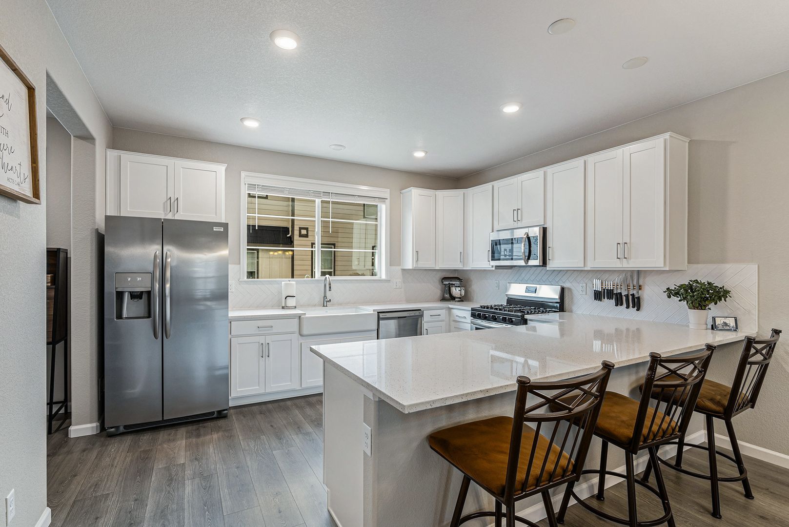 Inside, the home features a bright open-concept layout with modern laminate flooring and large windows that bring in plenty of natural light. The kitchen includes quartz countertops, 42-inch cabinetry, a farmhouse sink, stainless steel appliances with a gas range, and a walk-in pantry. An office nook located just off the kitchen provides a practical workspace. The kitchen opens to the main living area, creating a comfortable layout for everyday living and entertaining. A private balcony off the living room offers additional outdoor space.