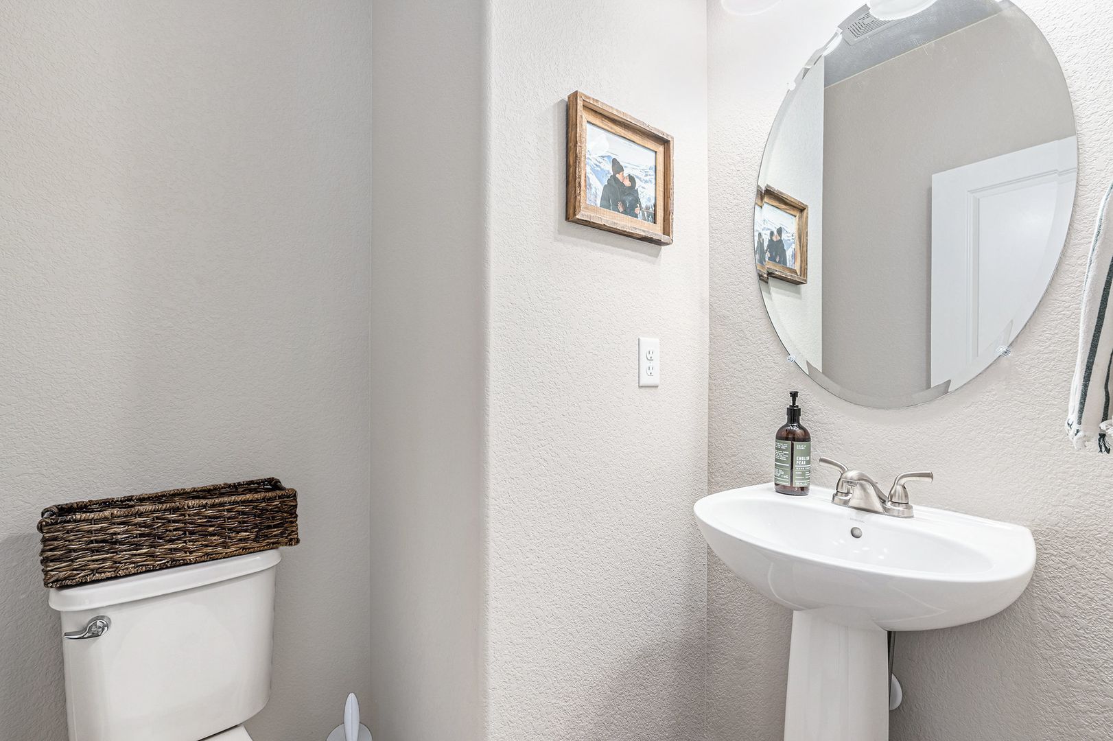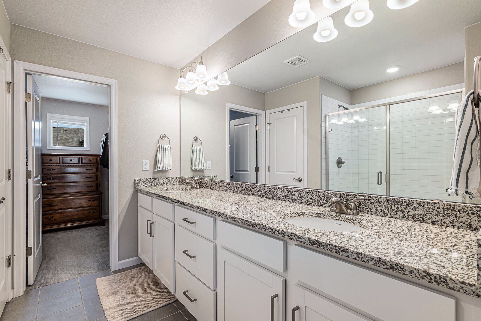 The upper level includes the primary suite with a private bathroom featuring dual sinks, an oversized shower, and a walk-in closet. A second bedroom, full bathroom, and laundry room are also located on this level.