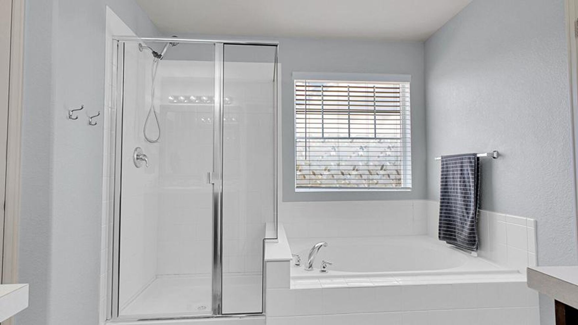 - Huge master suite featuring walk-in closet with built-in shelving, shower, tub, and double sinks