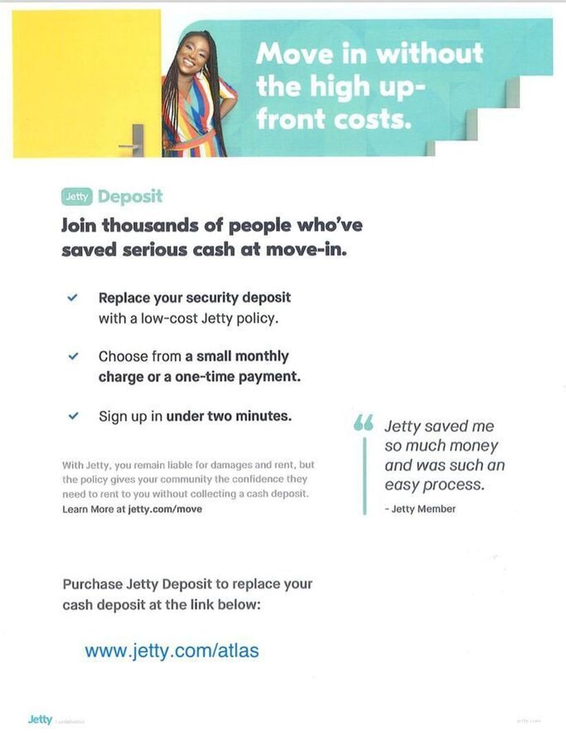 •Atlas Real Estate has partnered with Jetty to offer an affordable alternative to upfront cash security deposits. Approved residents can choose between paying a security deposit equal to one (1) month’s rent (On approved Credit) OR purchase a deposit replacement policy with Jetty at a fraction of the upfront cost.
