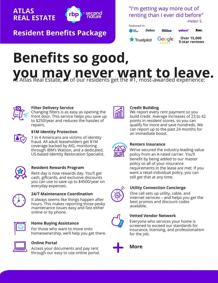 •This sweet deal makes life a breeze! It includes utility concierge, identity protection, 24/7 maintenance coordination, resident rewards program, credit building, and even renter’s insurance!